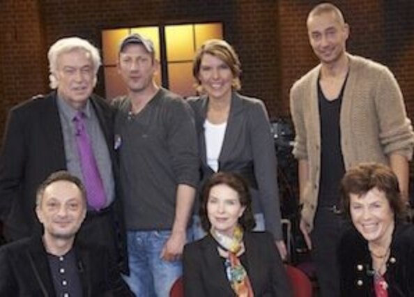 Gäste im „Kölner Treff“ am 14.10.2011: Autor Rainer Holbe, Schauspieler Wotan Wilke Möhring, Bettina Böttinger, der Magier Farid, der Schriftsteller Autor Feridun Zaimoglu und die Schauspielerinnen Gudrun Landgrebe und Margie Kinsky (v.l.).