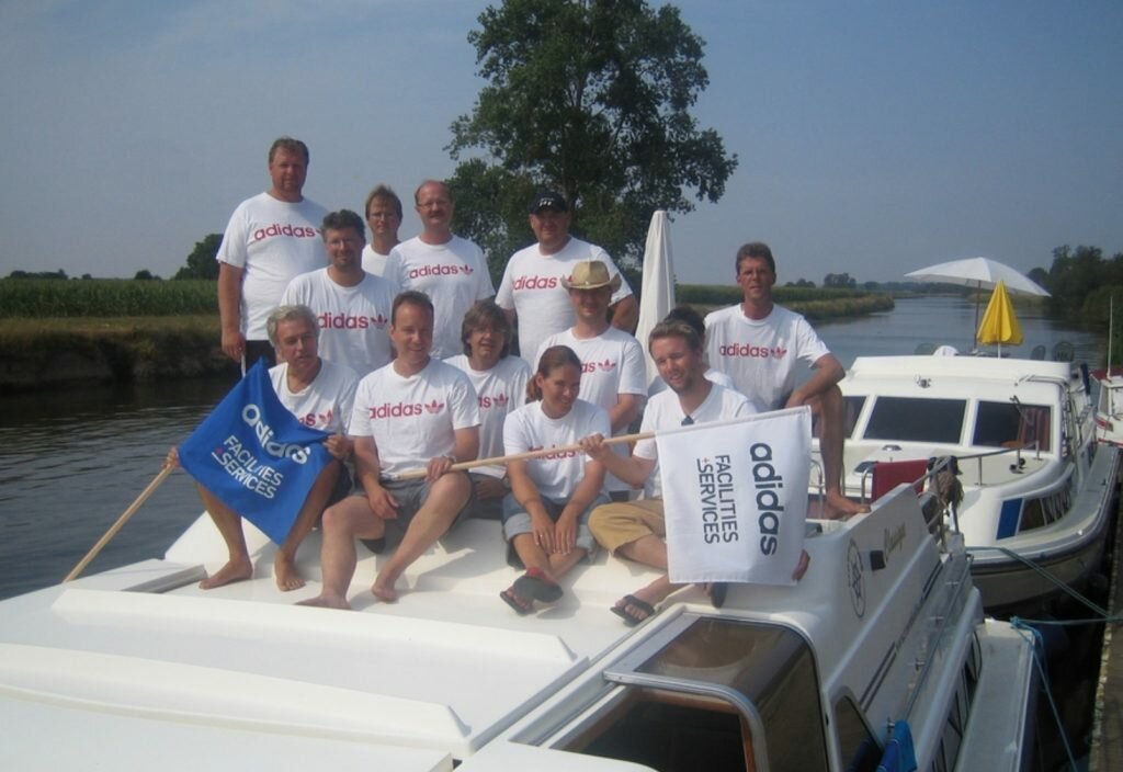 Rainer Holbe (links unten) als Veranstalter der Managerseminare „Panta rhei – alles fließt“ auf Kabinenbooten in der Bretagne für die Unternehmen Linde AG, adidas Group, Mäurer + Wirtz u.a.