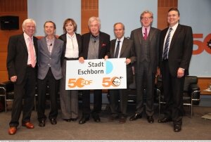 Vorstellung des Holbe Buches „Als die Mainzelmännchen laufen lernten“ in Eschborn – der Geburtsstadt des ZDF – mit Dieter Kürten, Wolf von Lojewski, Victoria Voncampe, Rainer Holbe, Dieter Stolte, Theo Koll und Bürgermeister Wilhelm Speckhardt (von links). Copyright Agentur Peter Bischoff