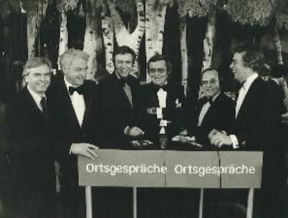 ZDF-„Ortsgespräche“ (von links) Dieter Kürten, Hanns-Joachim Friedrichs, Rainer Holbe, Horst Schättle, Karlheinz Rudolph, Dieter „Thomas“ Heck. Die Reihe war einer der ersten Talk-Sendungen im deutschen Fernsehen und wurde jeweils samstags gegen 18 Uhr von Schauplätzen wie dem Freiburger Kirchentag, der Berliner Tourismusmesse, den Hersfelder Festspielen u.a. ausgestrahlt. Das Foto zeigt die Moderatoren-Riege beim „Ball des Sports“ in der Frankfurter Jahrhunderthalle.